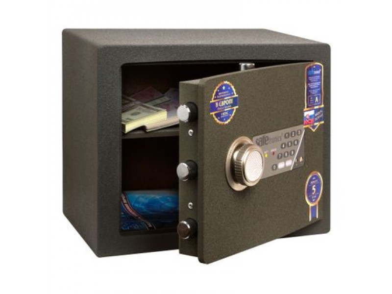 Стійкість до злому - EuroVDS (Німеччина), CSN - 9160010 (Чехія), клас 1. Товщина корпусу 20мм (сталь 3 мм - термостійкий наповнювач SMREKOLIT 14мм - сталь 3 мм), двері - 10 мм (передня панель), загальна товщина дверей - 49мм. Захист замку від висвердлювання і ригелів від вибивання, захищена 3мм пластиною з високолегованої марганцовістойсталі, яка практично не піддається механічній обробці. Можливість кріплення сейфів до стіни (два отвори Ø 12мм), до підлоги (два отвори Ø 16мм). Поліуретанові покриття (стійке до механічних пошкоджень), колір - оливковий. 3-х стороння ригеля замикання (5 активних ригеля, що обертаються - діаметром 22 мм).