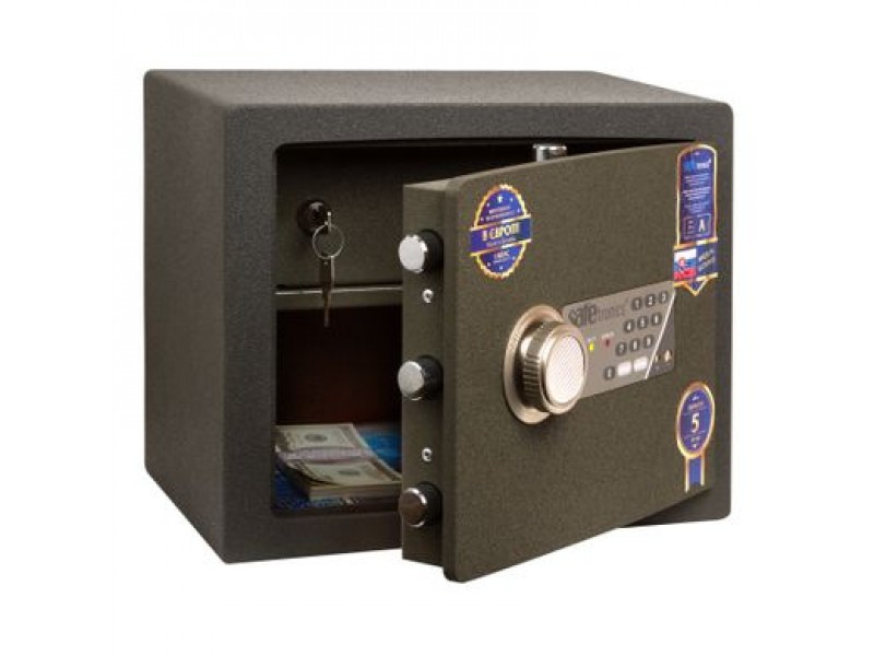 Стійкість до злому - EuroVDS (Німеччина), CSN - 9160010 (Чехія), клас 1. Товщина корпусу 20мм (сталь 3 мм - термостійкий наповнювач SMREKOLIT 14мм - сталь 3 мм), двері - 10 мм (передня панель), загальна товщина дверей - 49мм. Захист замку від висвердлювання і ригелів від вибивання, захищена 3мм пластиною з високолегованої марганцовістойсталі, яка практично не піддається механічній обробці. Можливість кріплення сейфів до стіни (два отвори Ø 12мм), до підлоги (два отвори Ø 16мм). Поліуретанові покриття (стійке до механічних пошкоджень), колір - оливковий. 3-х стороння ригеля замикання (5 активних ригеля, що обертаються - діаметром 22 мм).