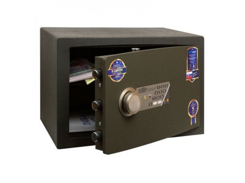 Стійкість до злому - EuroVDS (Німеччина), CSN - 9160010 (Чехія), клас 1. Товщина корпусу 20мм (сталь 3 мм - термостійкий наповнювач SMREKOLIT 14мм - сталь 3 мм), двері - 10 мм (передня панель), загальна товщина дверей - 49мм. Захист замку від висвердлювання і ригелів від вибивання, захищена 3мм пластиною з високолегованої марганцовістойсталі, яка практично не піддається механічній обробці. Можливість кріплення сейфів до стіни (два отвори Ø 12мм), до підлоги (два отвори Ø 16мм). Поліуретанові покриття (стійке до механічних пошкоджень), колір - оливковий. 3-х стороння ригеля замикання (5 активних ригеля, що обертаються - діаметром 22 мм).