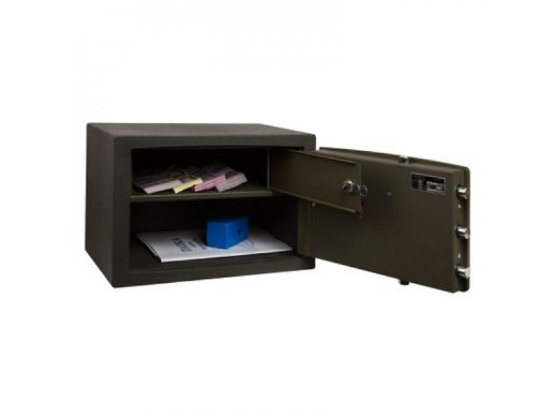 Стійкість до злому - EuroVDS (Німеччина), CSN - 9160010 (Чехія), клас 1. Товщина корпусу 20мм (сталь 3 мм - термостійкий наповнювач SMREKOLIT 14мм - сталь 3 мм), двері - 10 мм (передня панель), загальна товщина дверей - 49мм. Захист замку від висвердлювання і ригелів від вибивання, захищена 3мм пластиною з високолегованої марганцовістойсталі, яка практично не піддається механічній обробці. Можливість кріплення сейфів до стіни (два отвори Ø 12мм), до підлоги (два отвори Ø 16мм). Поліуретанові покриття (стійке до механічних пошкоджень), колір - оливковий. 3-х стороння ригеля замикання (5 активних ригеля, що обертаються - діаметром 22 мм).