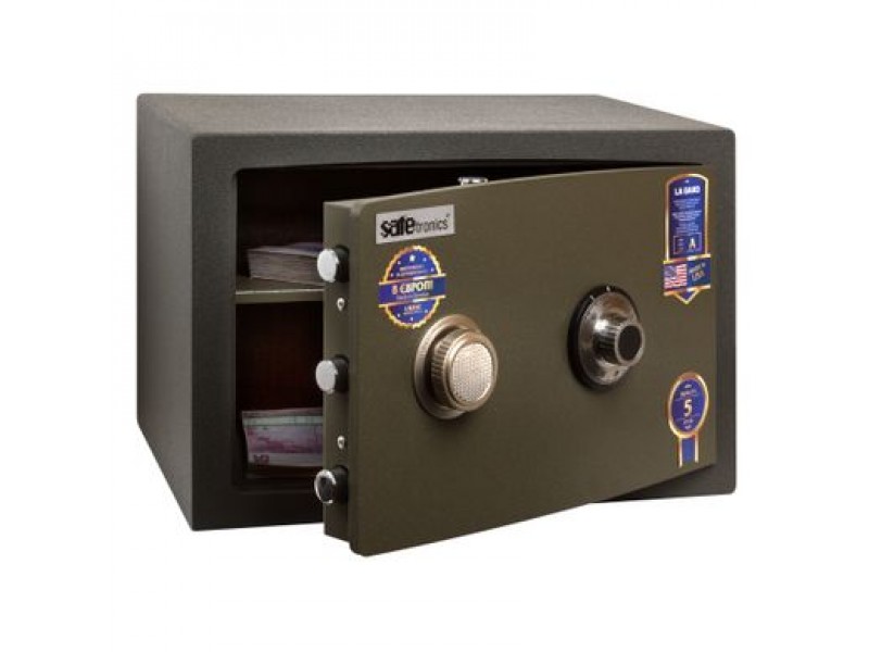 Стійкість до злому - EuroVDS (Німеччина), CSN - 9160010 (Чехія), клас 1. Товщина корпусу 20мм (сталь 3 мм - термостійкий наповнювач SMREKOLIT 14мм - сталь 3 мм), двері - 10 мм (передня панель), загальна товщина дверей - 49мм. Захист замку від висвердлювання і ригелів від вибивання, захищена 3мм пластиною з високолегованої марганцовістойсталі, яка практично не піддається механічній обробці. Можливість кріплення сейфів до стіни (два отвори Ø 12мм), до підлоги (два отвори Ø 16мм). Поліуретанові покриття (стійке до механічних пошкоджень), колір - оливковий. 3-х стороння ригеля замикання (5 активних ригеля, що обертаються - діаметром 22 мм).