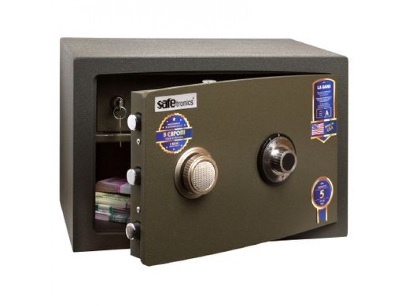 Стійкість до злому - EuroVDS (Німеччина), CSN - 9160010 (Чехія), клас 1. Товщина корпусу 20мм (сталь 3 мм - термостійкий наповнювач SMREKOLIT 14мм - сталь 3 мм), двері - 10 мм (передня панель), загальна товщина дверей - 49мм. Захист замку від висвердлювання і ригелів від вибивання, захищена 3мм пластиною з високолегованої марганцовістойсталі, яка практично не піддається механічній обробці. Можливість кріплення сейфів до стіни (два отвори Ø 12мм), до підлоги (два отвори Ø 16мм). Поліуретанові покриття (стійке до механічних пошкоджень), колір - оливковий. 3-х стороння ригеля замикання (5 активних ригеля, що обертаються - діаметром 22 мм).