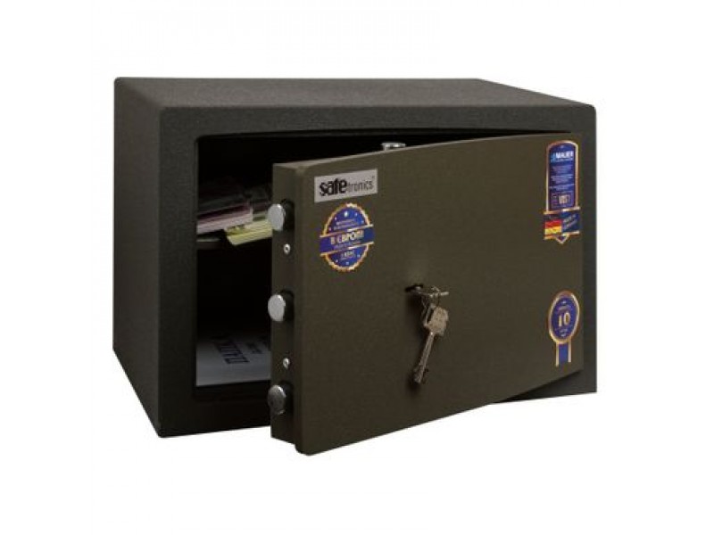 Стійкість до злому - EuroVDS (Німеччина), CSN - 9160010 (Чехія), клас 1. Товщина корпусу 20мм (сталь 3 мм - термостійкий наповнювач SMREKOLIT 14мм - сталь 3 мм), двері - 10 мм (передня панель), загальна товщина дверей - 49мм. Захист замку від висвердлювання і ригелів від вибивання, захищена 3мм пластиною з високолегованої марганцовістойсталі, яка практично не піддається механічній обробці. Можливість кріплення сейфів до стіни (два отвори Ø 12мм), до підлоги (два отвори Ø 16мм). Поліуретанові покриття (стійке до механічних пошкоджень), колір - оливковий. 3-х стороння ригеля замикання (5 активних ригеля, що обертаються - діаметром 22 мм).