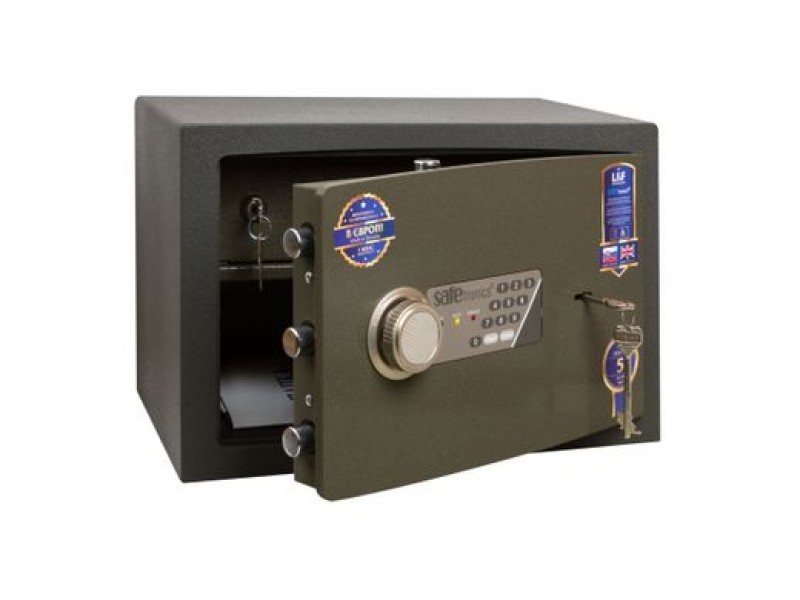 Стійкість до злому - EuroVDS (Німеччина), CSN - 9160010 (Чехія), клас 1. Товщина корпусу 20мм (сталь 3 мм - термостійкий наповнювач SMREKOLIT 14мм - сталь 3 мм), двері - 10 мм (передня панель), загальна товщина дверей - 49мм. Захист замку від висвердлювання і ригелів від вибивання, захищена 3мм пластиною з високолегованої марганцовістойсталі, яка практично не піддається механічній обробці. Можливість кріплення сейфів до стіни (два отвори Ø 12мм), до підлоги (два отвори Ø 16мм). Поліуретанові покриття (стійке до механічних пошкоджень), колір - оливковий. 3-х стороння ригеля замикання (5 активних ригеля, що обертаються - діаметром 22 мм).
