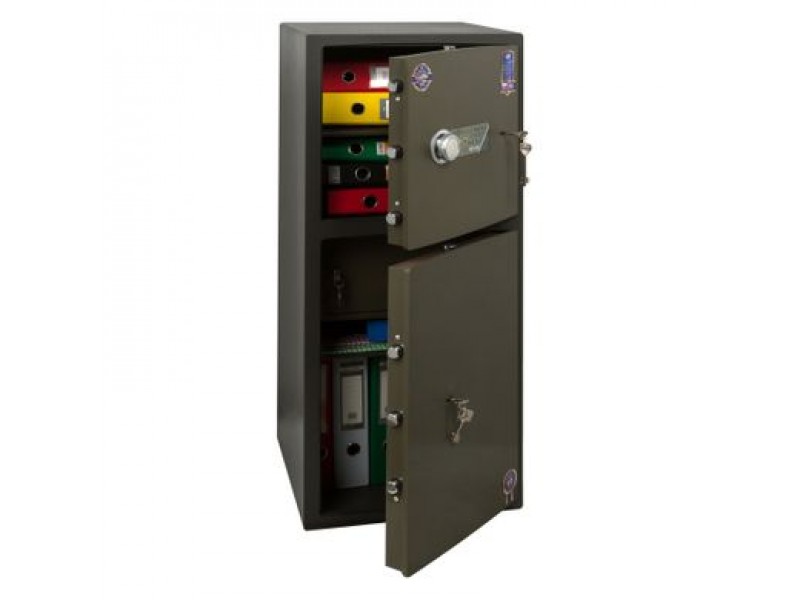 Стійкість до злому - EuroVDS (Німеччина), CSN - 9160010 (Чехія), клас 1. Товщина корпусу 20мм (сталь 3 мм - термостійкий наповнювач SMREKOLIT 14мм - сталь 3 мм), двері - 10 мм (передня панель), загальна товщина дверей - 49мм. Захист замку від висвердлювання і ригелів від вибивання, захищена 3мм пластиною з високолегованої марганцовістойсталі, яка практично не піддається механічній обробці. Можливість кріплення сейфів до стіни (два отвори Ø 12мм), до підлоги (два отвори Ø 16мм). Поліуретанові покриття (стійке до механічних пошкоджень), колір - оливковий. 3-х стороння ригеля замикання (5 активних ригеля, що обертаються - діаметром 22 мм).