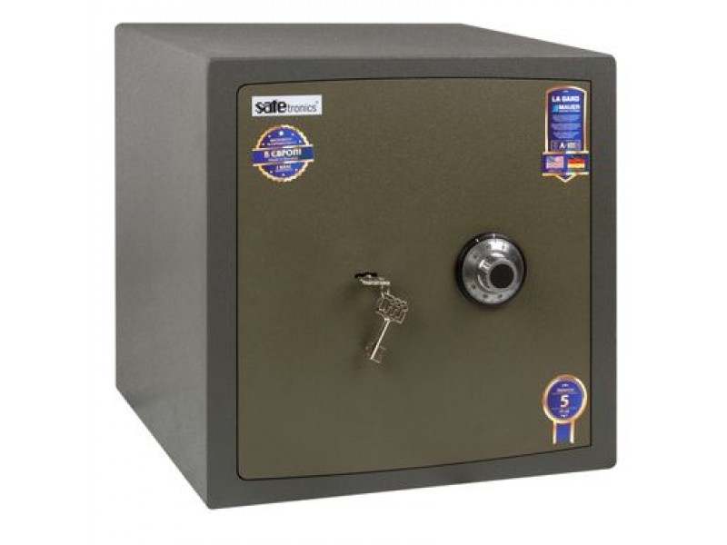 Стійкість до злому - EuroVDS (Німеччина), CSN - 9160010 (Чехія), клас 1. Товщина корпусу 20мм (сталь 3 мм - термостійкий наповнювач SMREKOLIT 14мм - сталь 3 мм), двері - 10 мм (передня панель), загальна товщина дверей - 49мм. Захист замку від висвердлювання і ригелів від вибивання, захищена 3мм пластиною з високолегованої марганцовістойсталі, яка практично не піддається механічній обробці. Можливість кріплення сейфів до стіни (два отвори Ø 12мм), до підлоги (два отвори Ø 16мм). Поліуретанові покриття (стійке до механічних пошкоджень), колір - оливковий. 3-х стороння ригеля замикання (5 активних ригеля, що обертаються - діаметром 22 мм).