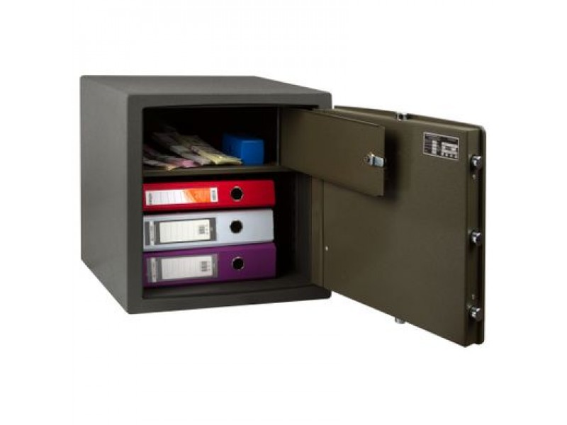 Стійкість до злому - EuroVDS (Німеччина), CSN - 9160010 (Чехія), клас 1. Товщина корпусу 20мм (сталь 3 мм - термостійкий наповнювач SMREKOLIT 14мм - сталь 3 мм), двері - 10 мм (передня панель), загальна товщина дверей - 49мм. Захист замку від висвердлювання і ригелів від вибивання, захищена 3мм пластиною з високолегованої марганцовістойсталі, яка практично не піддається механічній обробці. Можливість кріплення сейфів до стіни (два отвори Ø 12мм), до підлоги (два отвори Ø 16мм). Поліуретанові покриття (стійке до механічних пошкоджень), колір - оливковий. 3-х стороння ригеля замикання (5 активних ригеля, що обертаються - діаметром 22 мм).