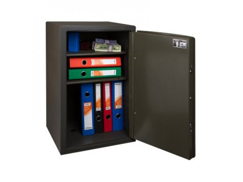 Стійкість до злому - EuroVDS (Німеччина), CSN - 9160010 (Чехія), клас 1. Товщина корпусу 20мм (сталь 3 мм - термостійкий наповнювач SMREKOLIT 14мм - сталь 3 мм), двері - 10 мм (передня панель), загальна товщина дверей - 49мм. Захист замку від висвердлювання і ригелів від вибивання, захищена 3мм пластиною з високолегованої марганцовістойсталі, яка практично не піддається механічній обробці. Можливість кріплення сейфів до стіни (два отвори Ø 12мм), до підлоги (два отвори Ø 16мм). Поліуретанові покриття (стійке до механічних пошкоджень), колір - оливковий. 3-х стороння ригеля замикання (5 активних ригеля, що обертаються - діаметром 22 мм).