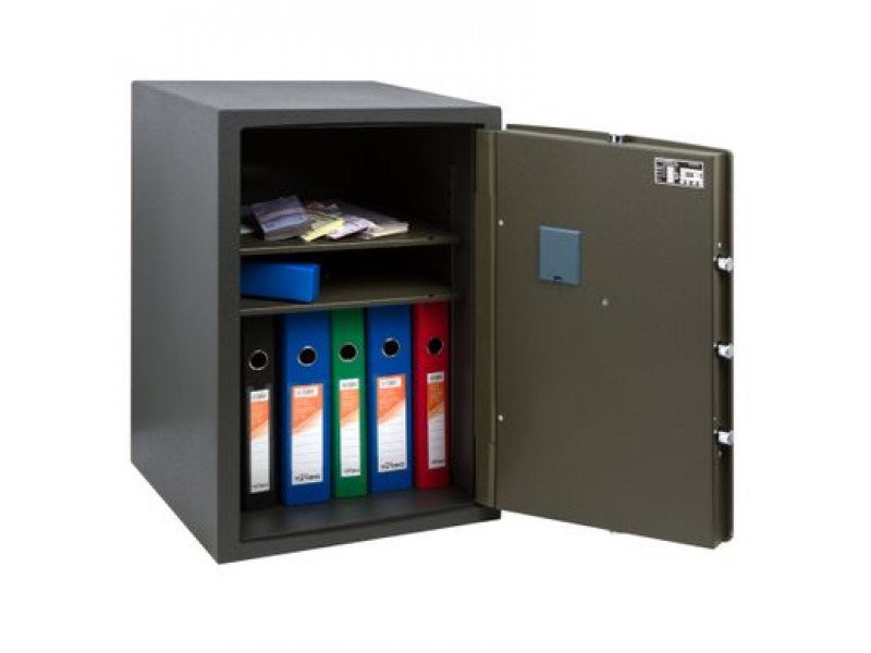 Стійкість до злому - EuroVDS (Німеччина), CSN - 9160010 (Чехія), клас 1. Товщина корпусу 20мм (сталь 3 мм - термостійкий наповнювач SMREKOLIT 14мм - сталь 3 мм), двері - 10 мм (передня панель), загальна товщина дверей - 49мм. Захист замку від висвердлювання і ригелів від вибивання, захищена 3мм пластиною з високолегованої марганцовістойсталі, яка практично не піддається механічній обробці. Можливість кріплення сейфів до стіни (два отвори Ø 12мм), до підлоги (два отвори Ø 16мм). Поліуретанові покриття (стійке до механічних пошкоджень), колір - оливковий. 3-х стороння ригеля замикання (5 активних ригеля, що обертаються - діаметром 22 мм).